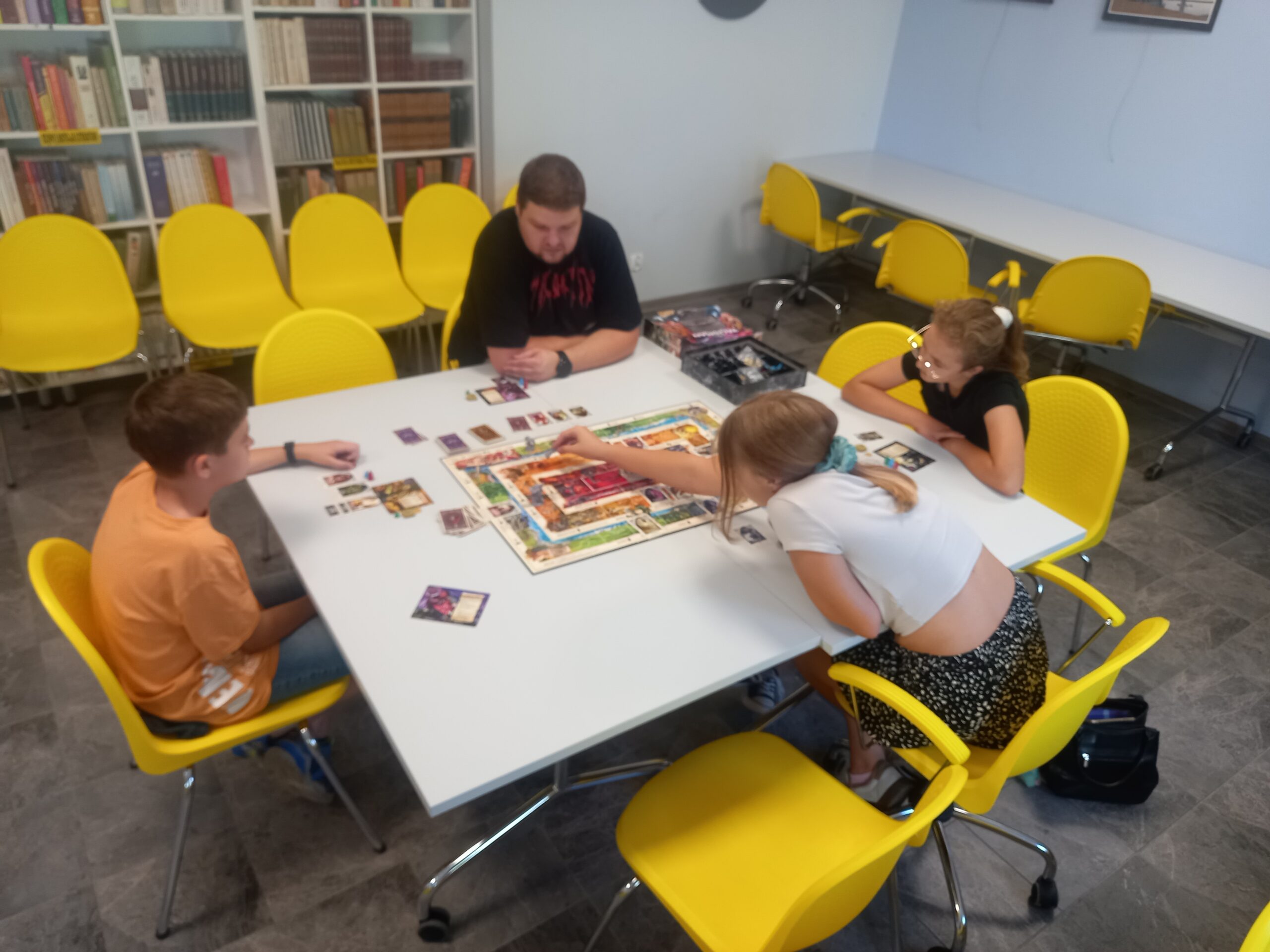 Tegoroczne wakacje upłynęły w bibliotece pod znakiem doskonałej zabawy i planszówkowych emocji. W lipcowe i sierpniowe, poniedziałki, środy i piątki odbywały się spotkania z grami planszowymi, które przyciągnęły miłośników tej formy rozrywki. Uczestnicy mogli spróbować swoich sił w takich grach jak „Talizman”, „Wiedźmin” i innych grach strategicznych, przygodowych i rodzinnych. Spotkania prowadził Grzegorz Dudenko, wieloletni czytelnik biblioteki oraz aktywny członek Młodzieżowego Dyskusyjnego Klubu Książki, który z pasją wprowadzał uczestników w zasady poszczególnych gier, doradzał przy wyborze tytułów i dbał o dobrą atmosferę podczas rozgrywek.